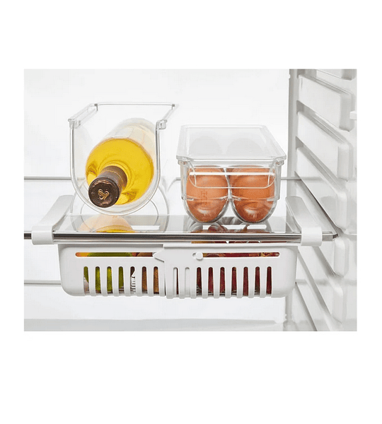 Maximice el espacio en su refrigerador con este organizador de botellas. El diseño transparente le permite identificar fácilmente el contenido, haciéndolo conveniente para almacenar y acceder a distintas botellas.